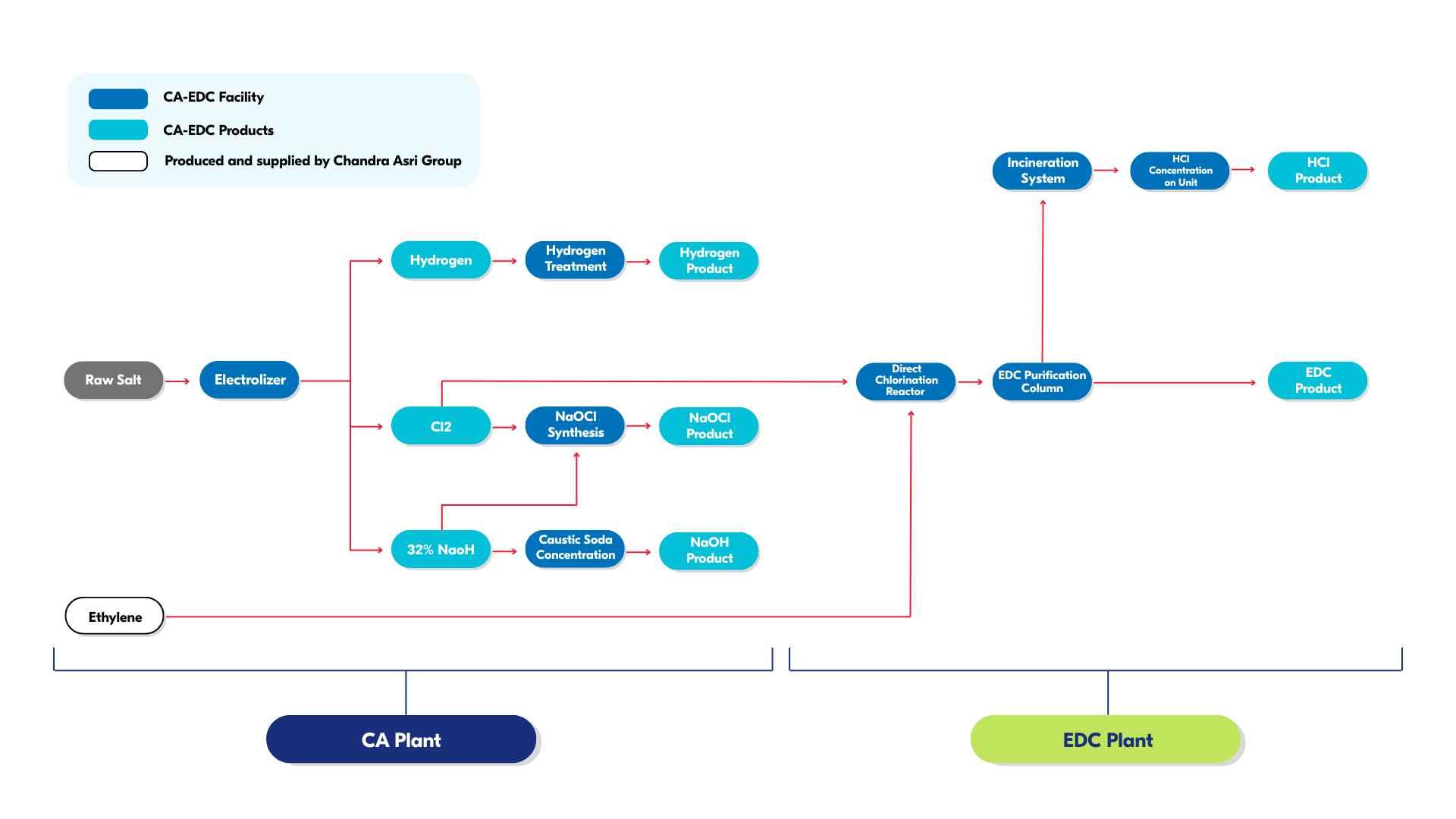 Chandra Asri Group adalah perusahaan kimia terkemuka di Indonesia yang mengoperasikan kompleks petrokimia terintegrasi terbesar di negara ini. Kami terus bertumbuh secara organik melalui proyek-proyek seperti pabrik CA-EDC, yang mendukung ekosistem kendaraan listrik (EV) dan berbagai industri penting dengan memproduksi kaustik soda dan etilena diklorida.